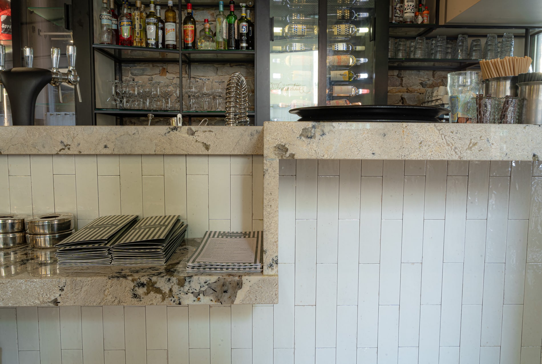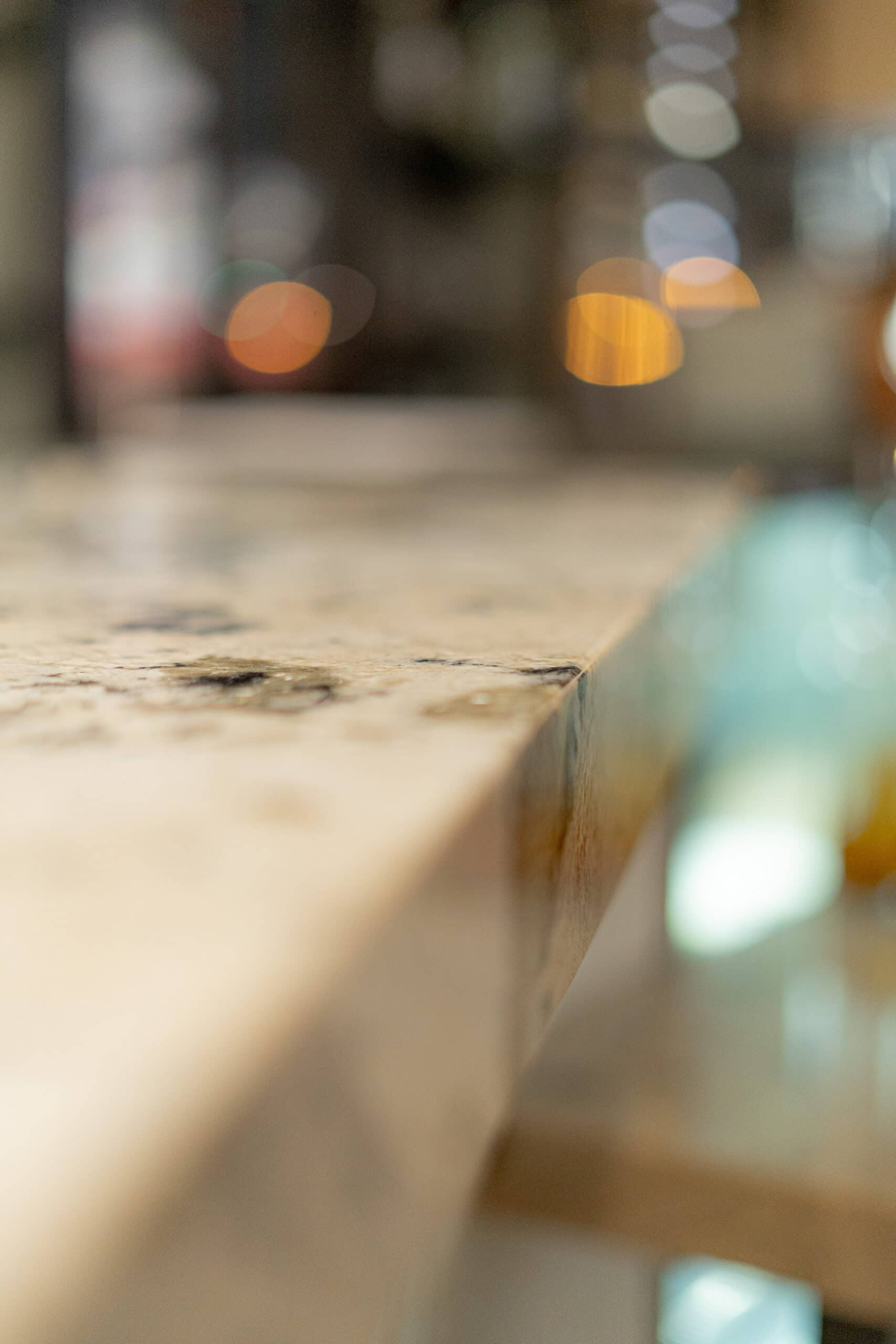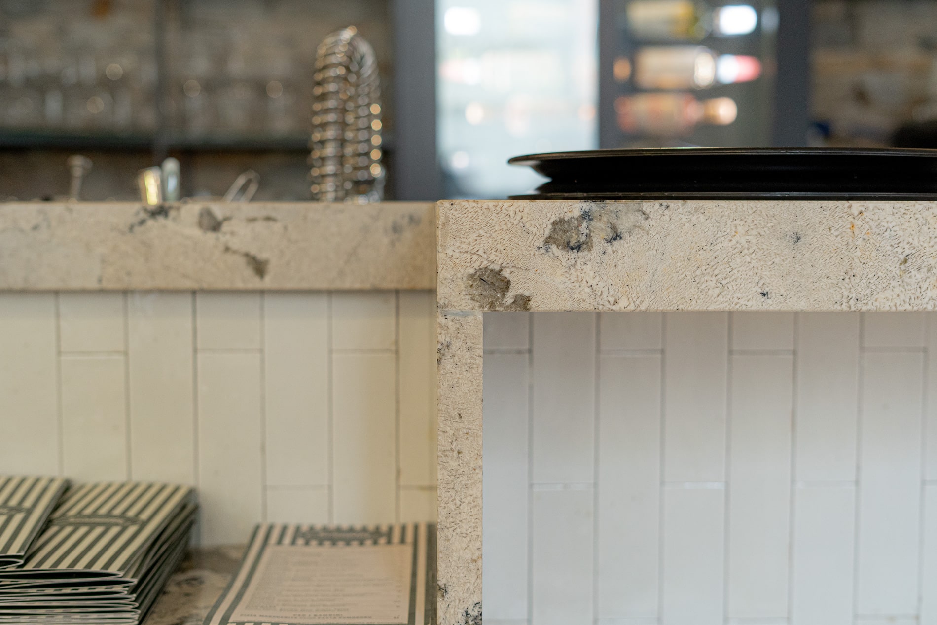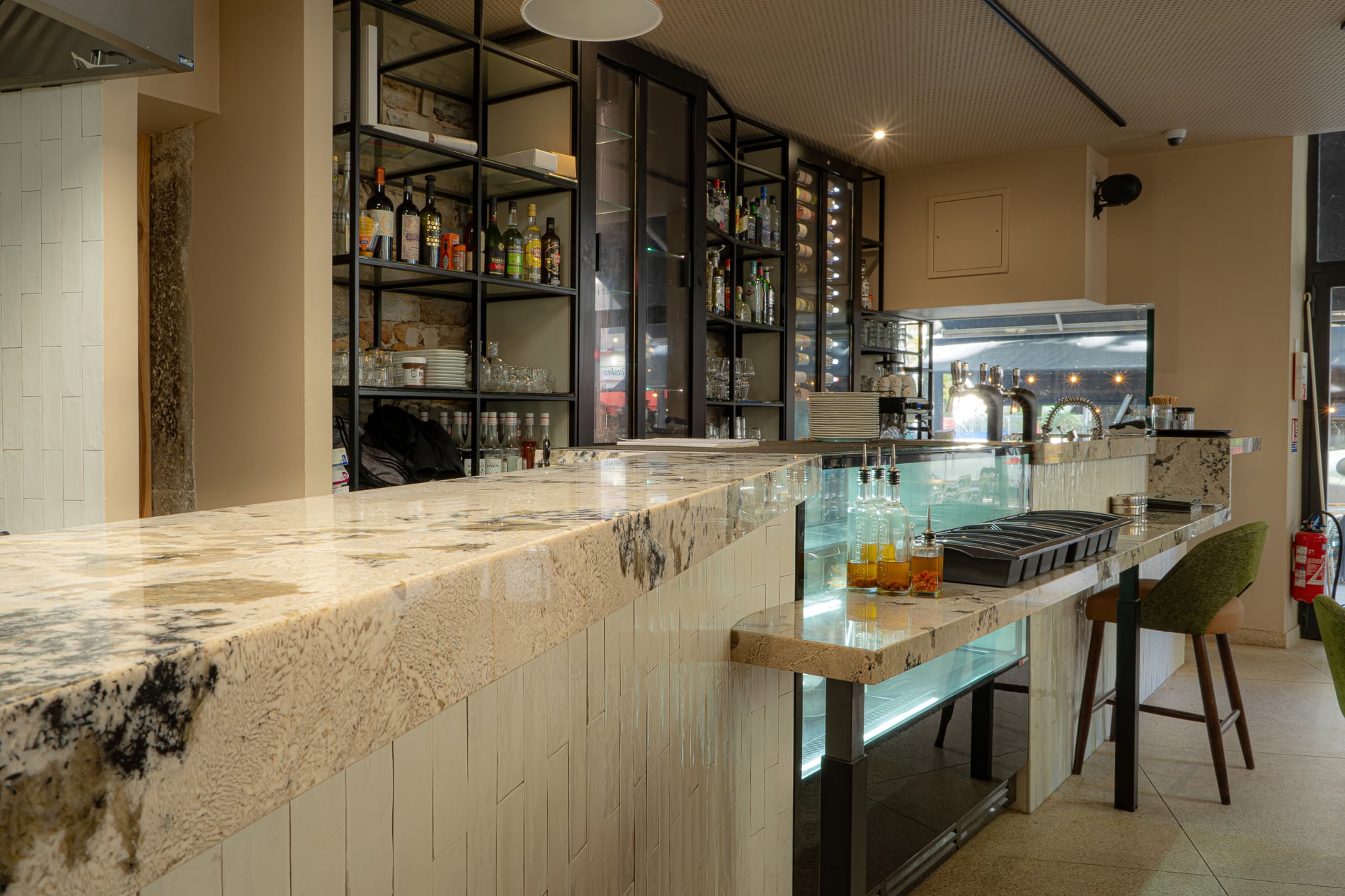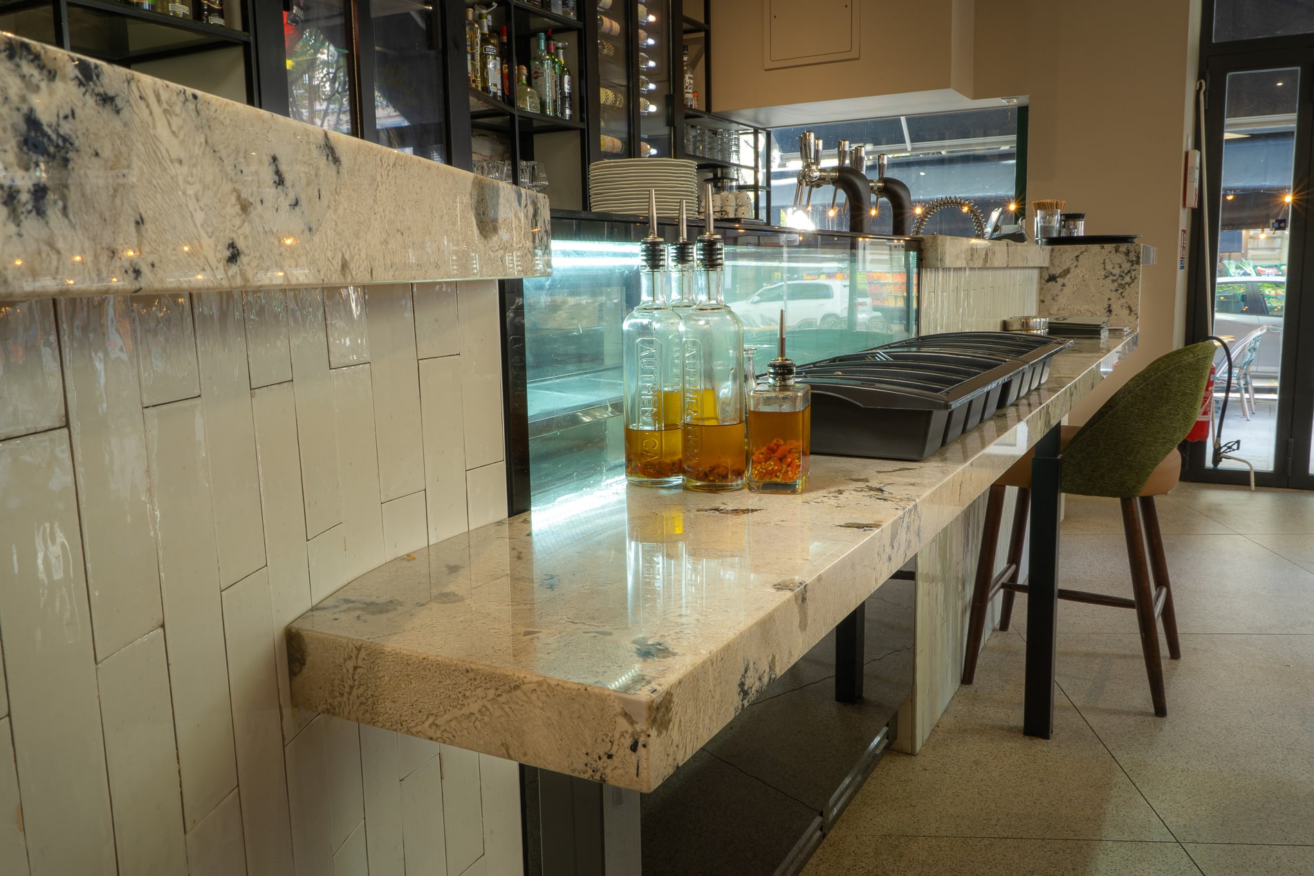 PMG Concept a imaginé et façonné un bar sur mesure, déployé sur toute la profondeur du restaurant, pensé à la fois pour la présentation des plats chauds et le service des boissons. Cet aménagement est complété par une table réalisée dans le même granit, créant un rappel visuel fort et s’imposant comme une véritable pièce maîtresse au cœur du lieu.