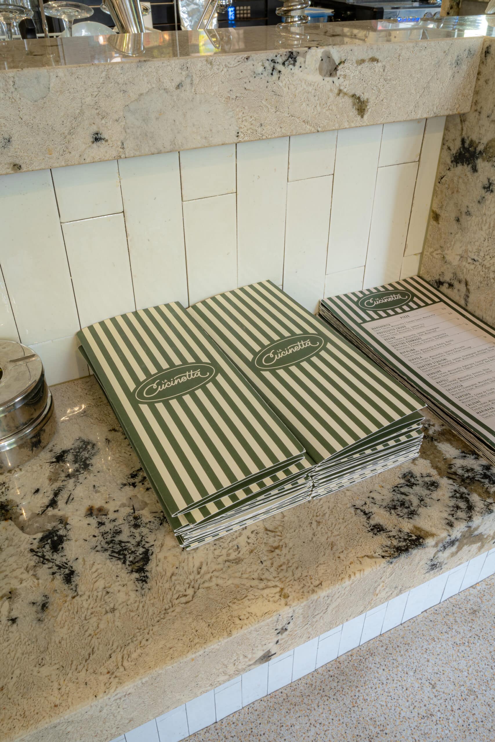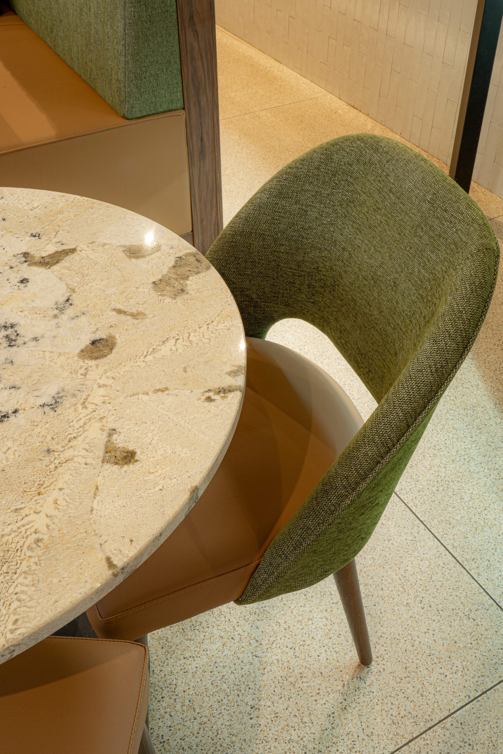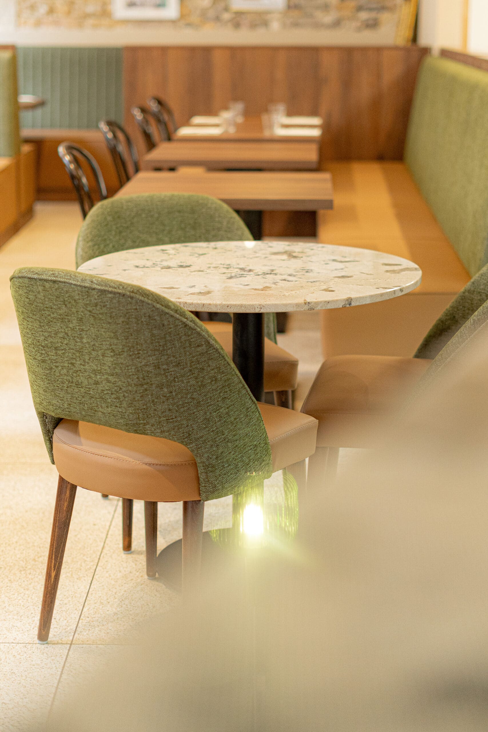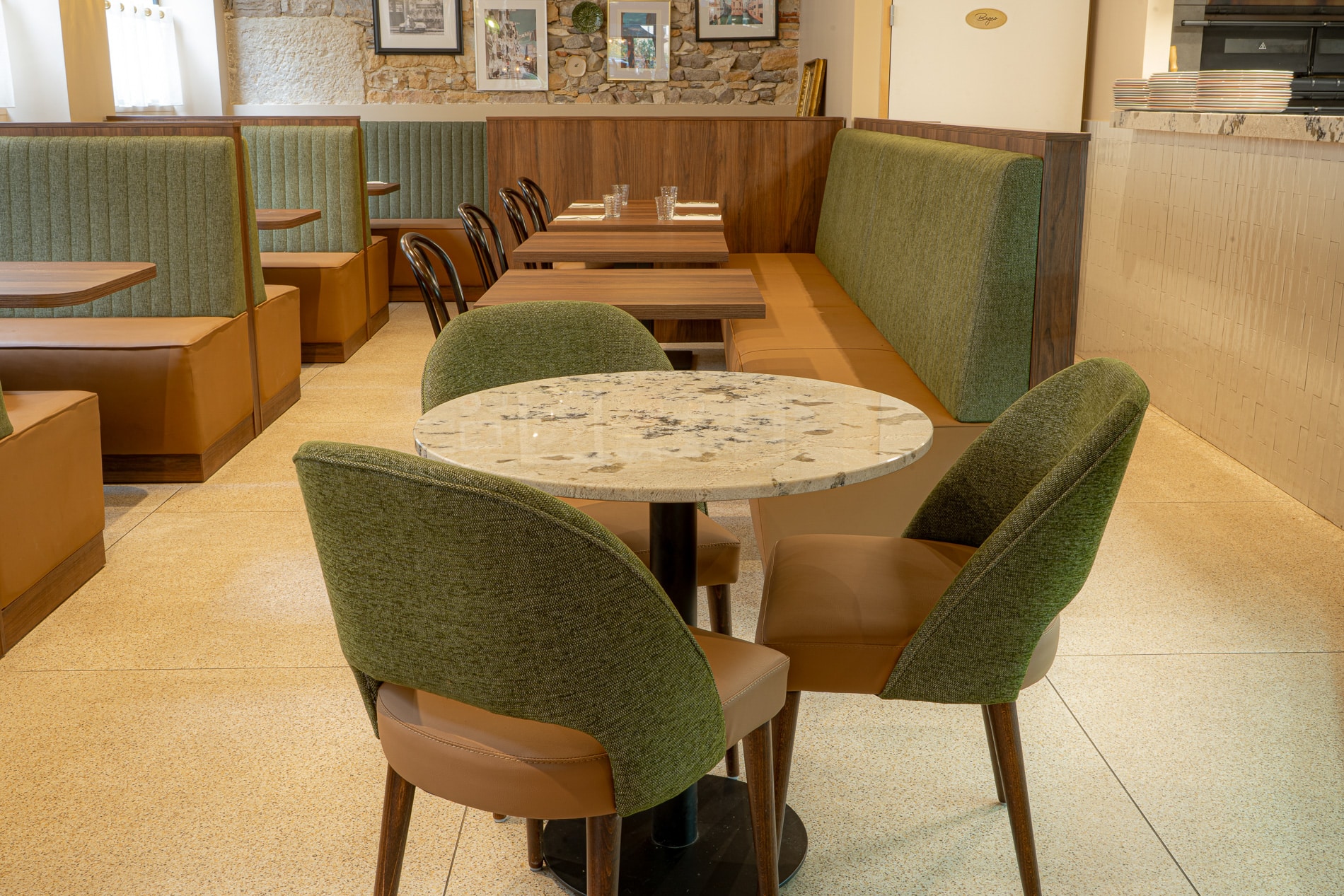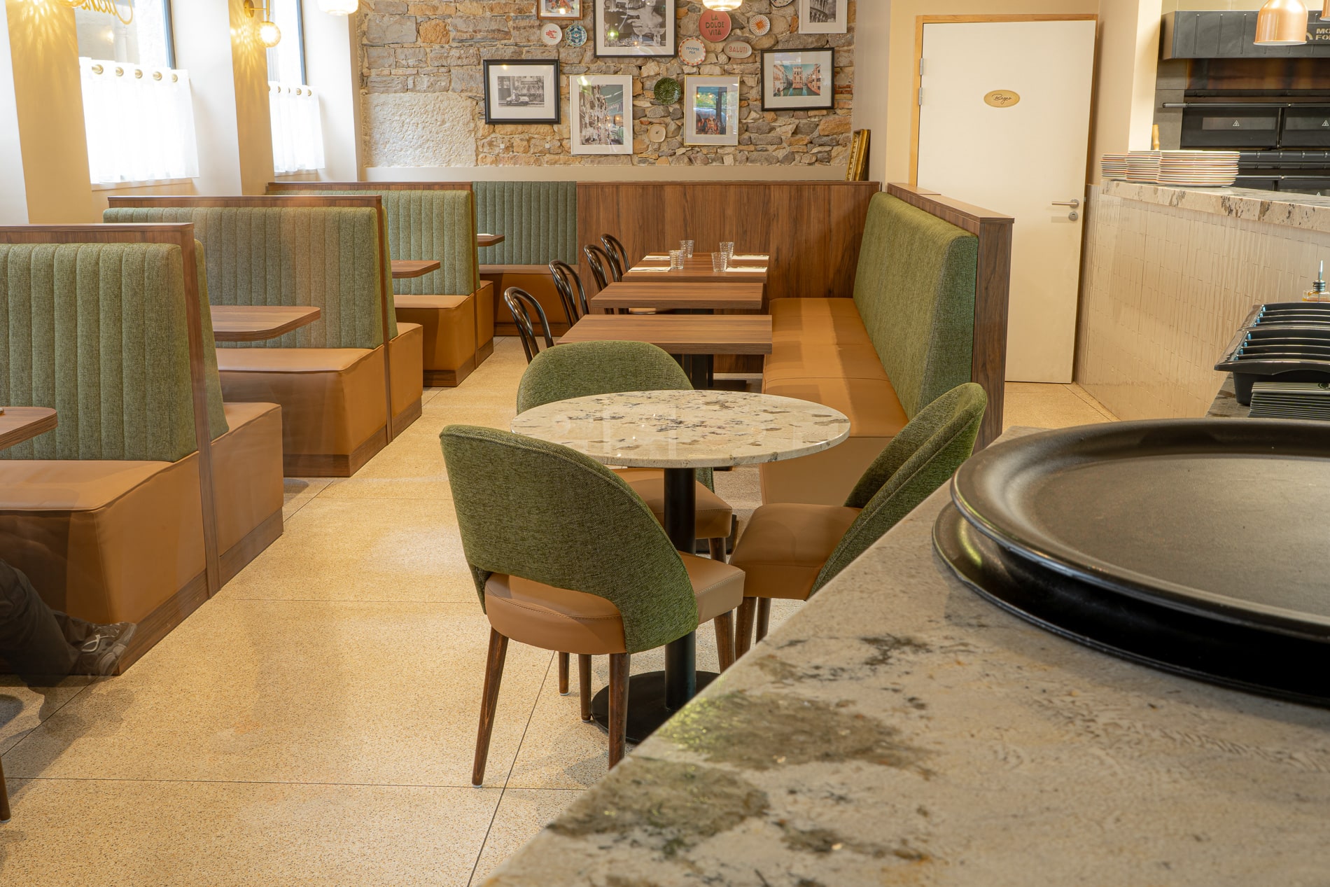 Le projet La Cucinetta, dans un restaurant du Vieux Lyon, met en lumière le granit White Babylon, une pierre naturelle au fond clair, ponctuée de cristaux scintillants et délicatement traversée de veinures vertes. Ce matériau d’exception apporte profondeur et raffinement à l’espace, tout en s’harmonisant avec les éléments en bois, les chaises et les banquettes vertes, créant une ambiance chaleureuse et naturelle au sein du restaurant.
