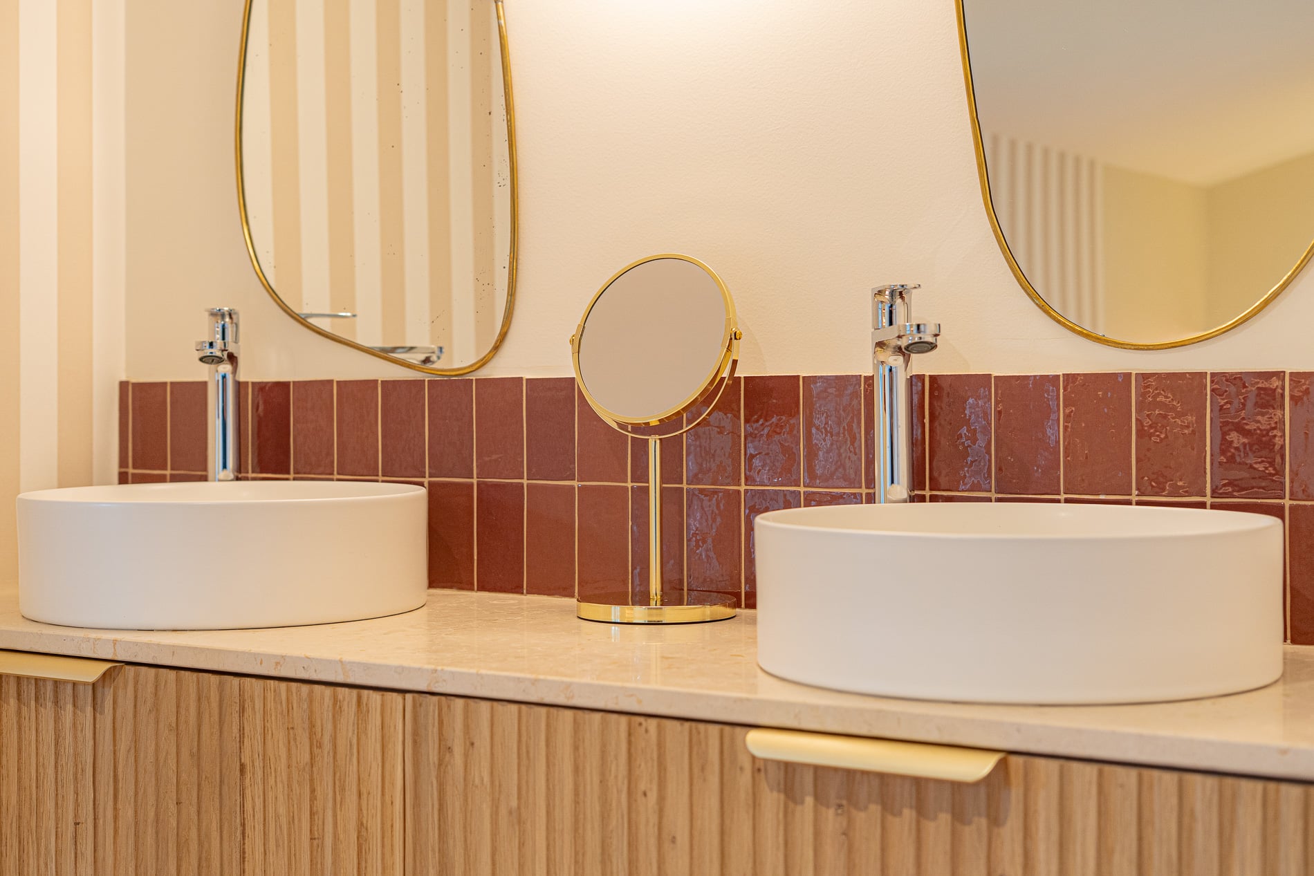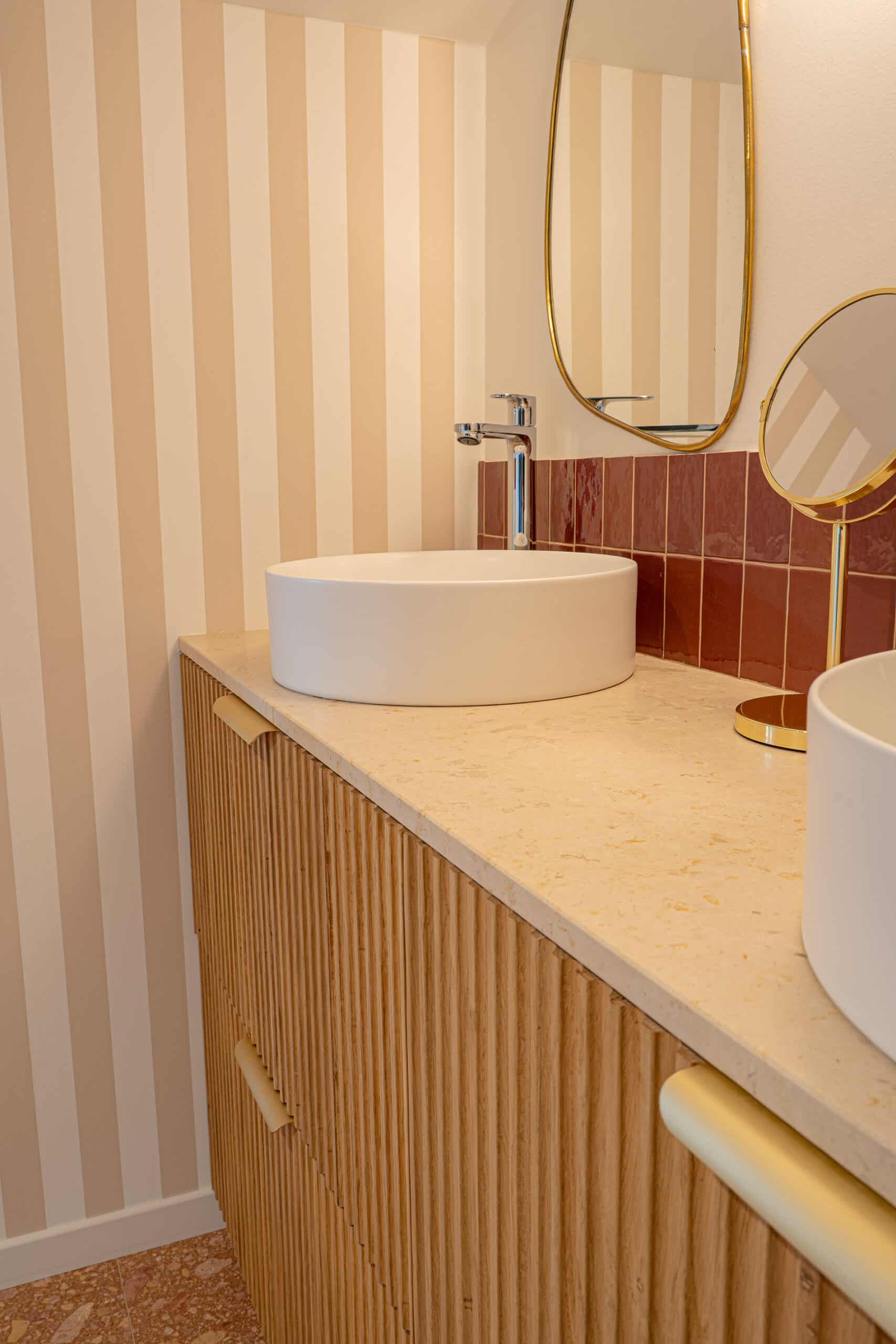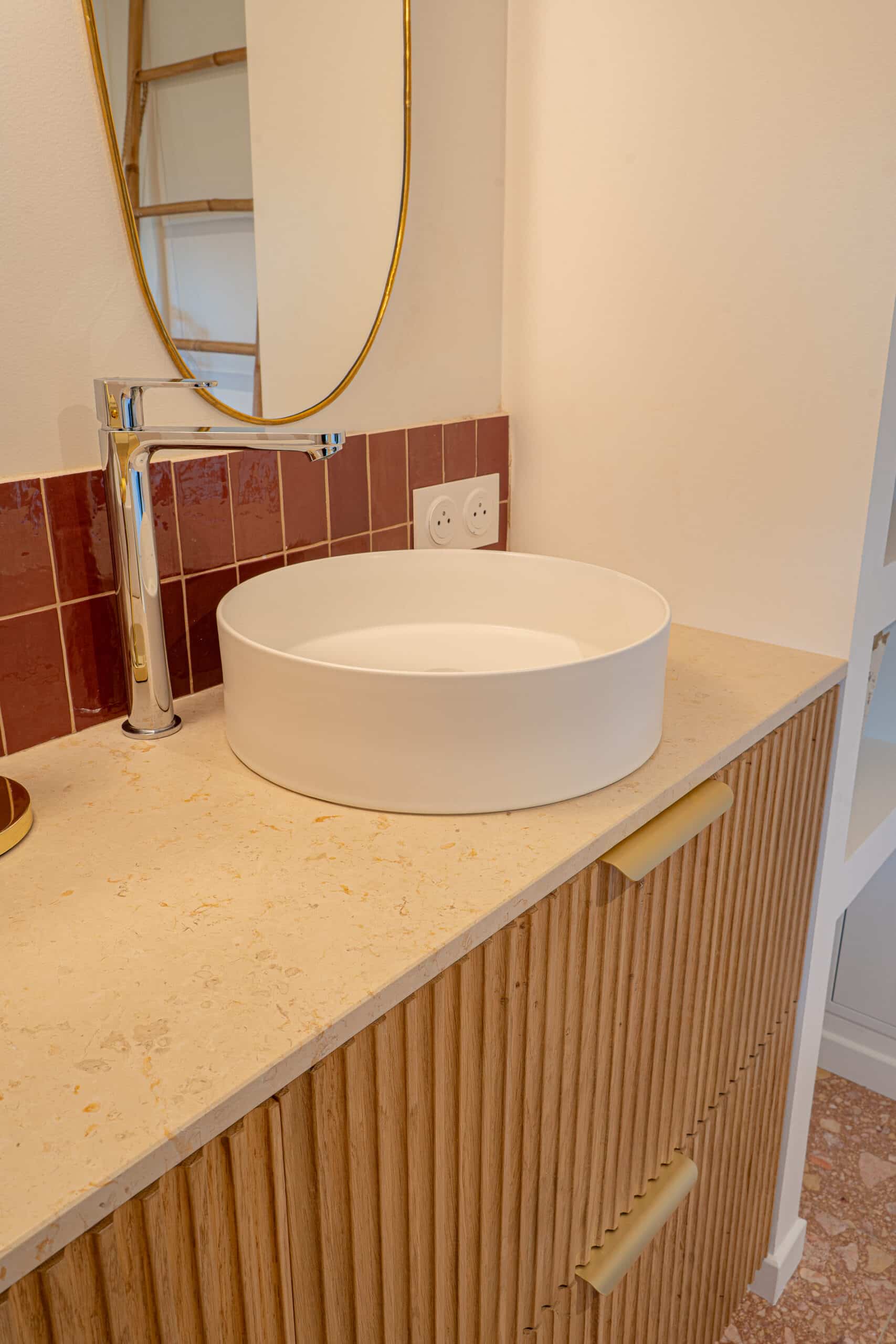 Le plan de salle de bain, conçu sur mesure, repose sur un meuble en bois et intègre deux vasque élégantes. L’ensemble est complété par une crédence en carrelage rouge, qui apporte une touche de contraste subtile et renforce le caractère de cette salle de bain.