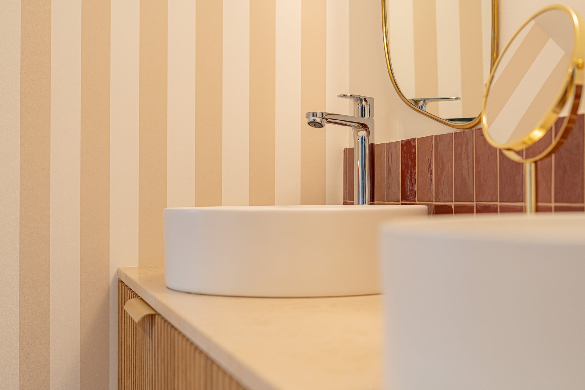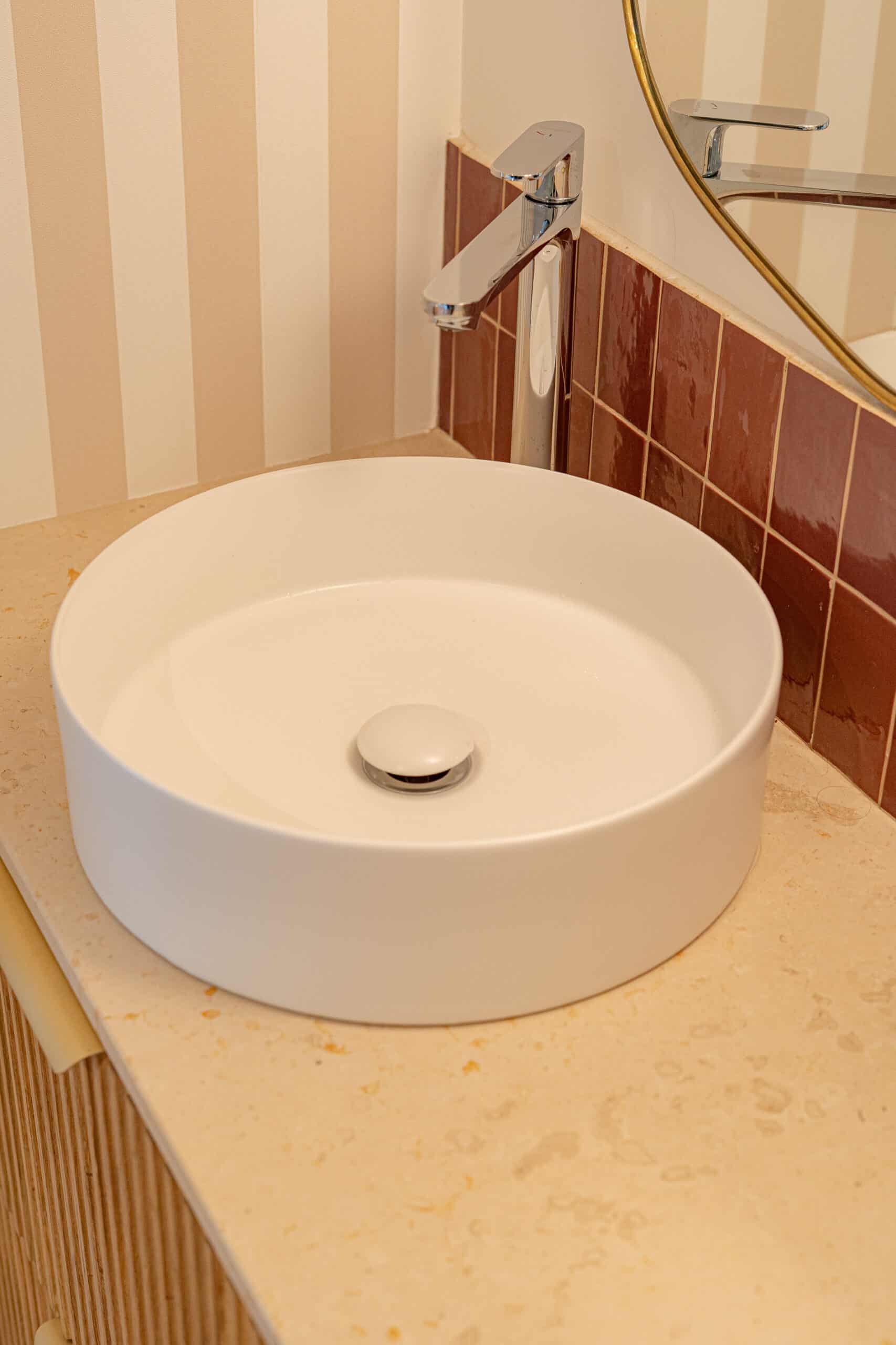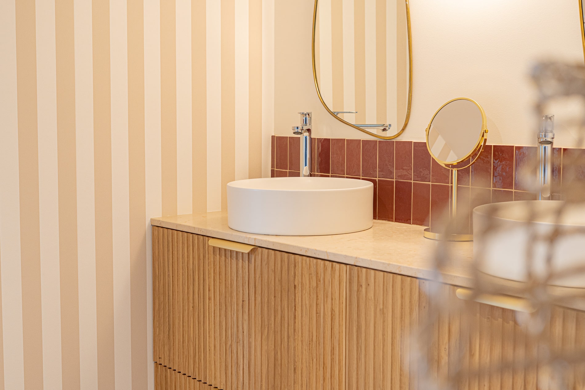 Le plan de salle de bain, conçu sur mesure, repose sur un meuble en bois et intègre deux vasque élégantes. L’ensemble est complété par une crédence en carrelage rouge, qui apporte une touche de contraste subtile et renforce le caractère de cette salle de bain.