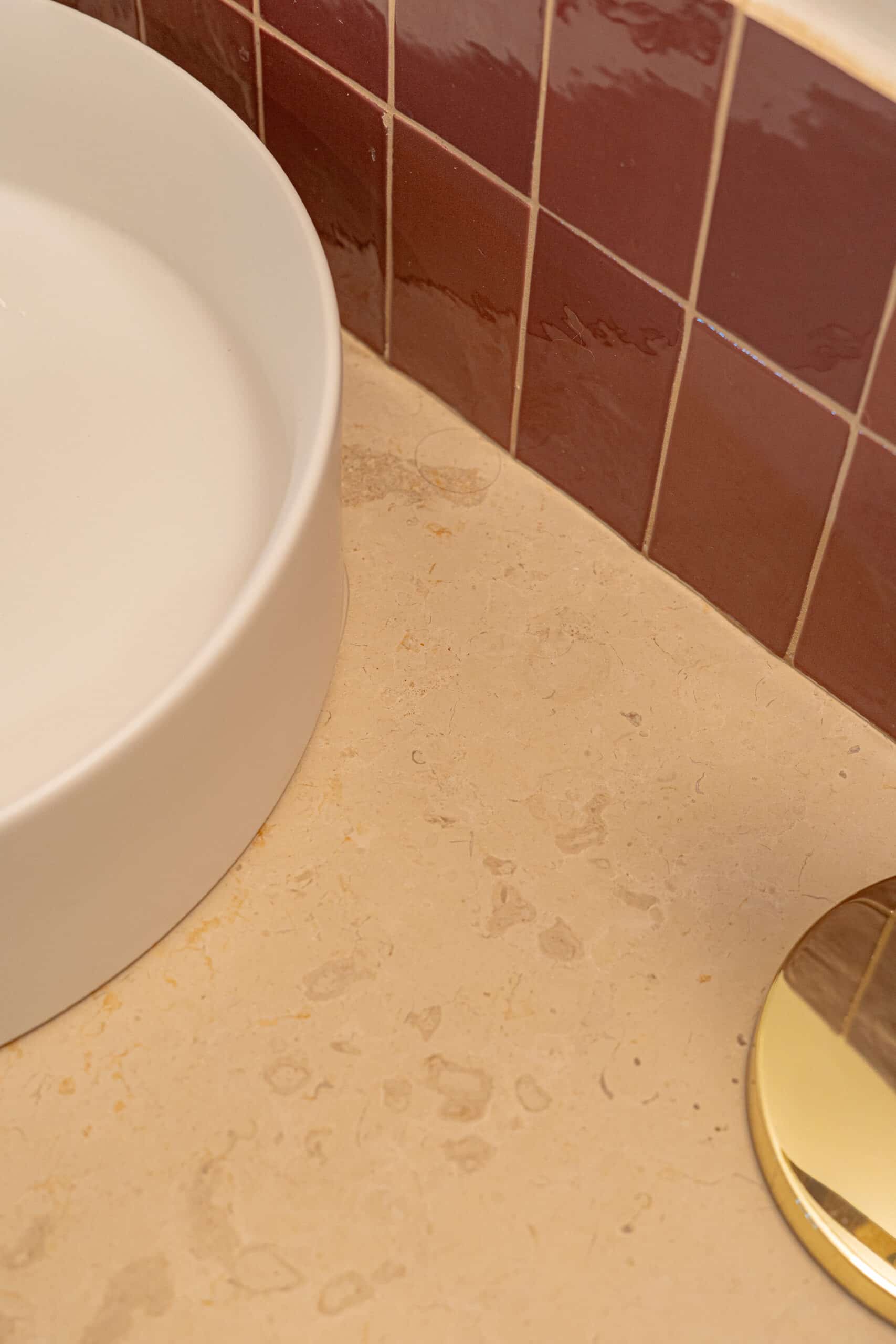 Le projet Salle de bain d’Alix met en valeur la pierre calcaire Seline, un matériau naturel originaire de Croatie. Cette pierre se distingue par ses grains orangés et dorés délicatement répartis sur un fond beige, apportant chaleur et caractère à l’espace.