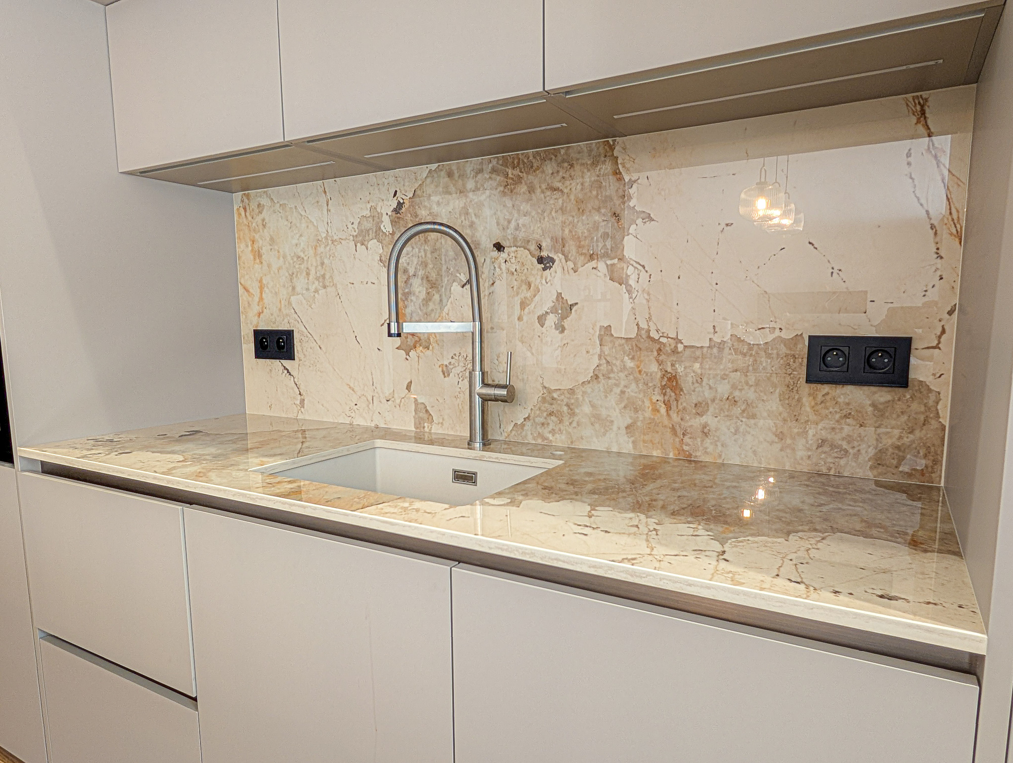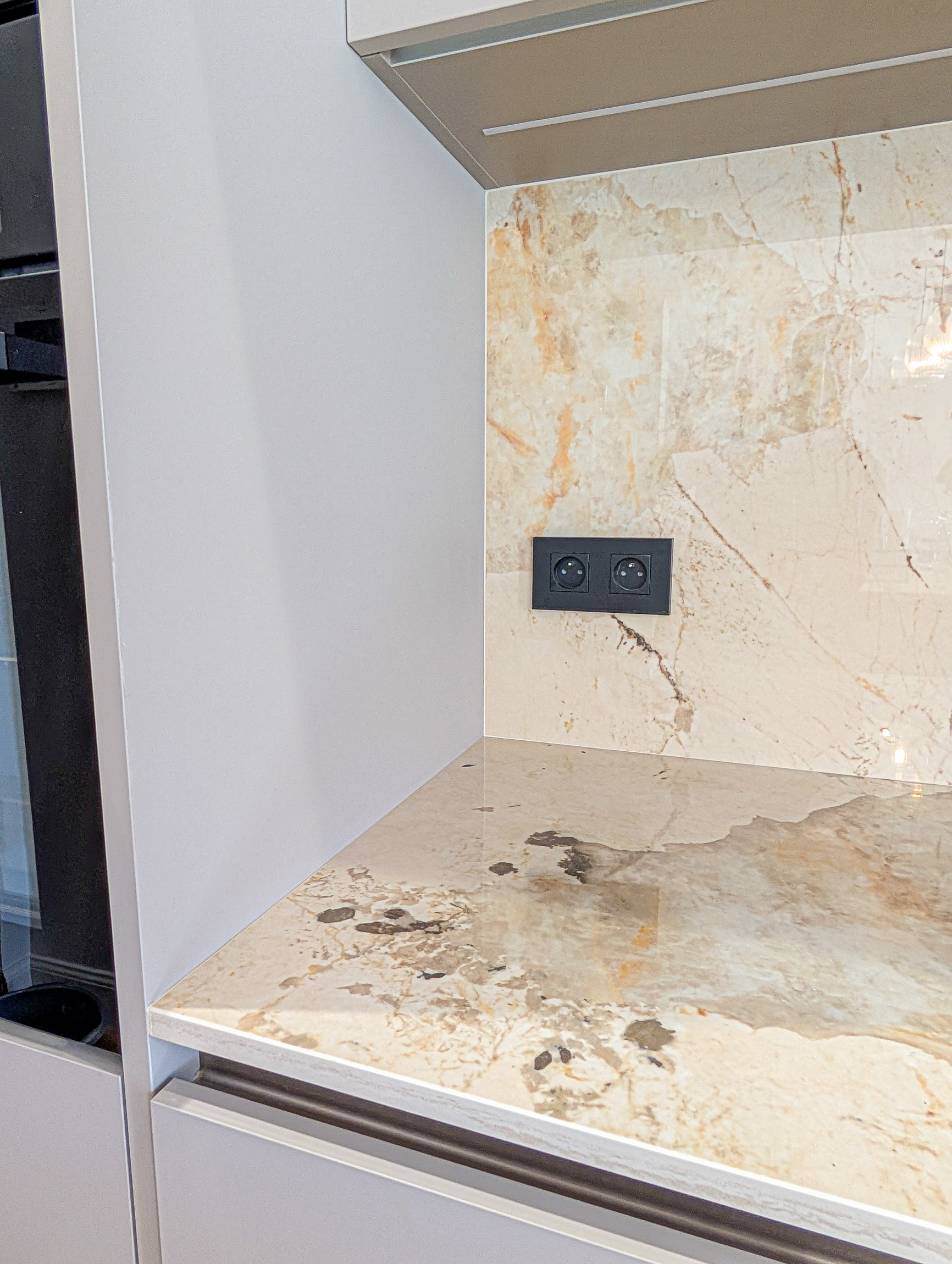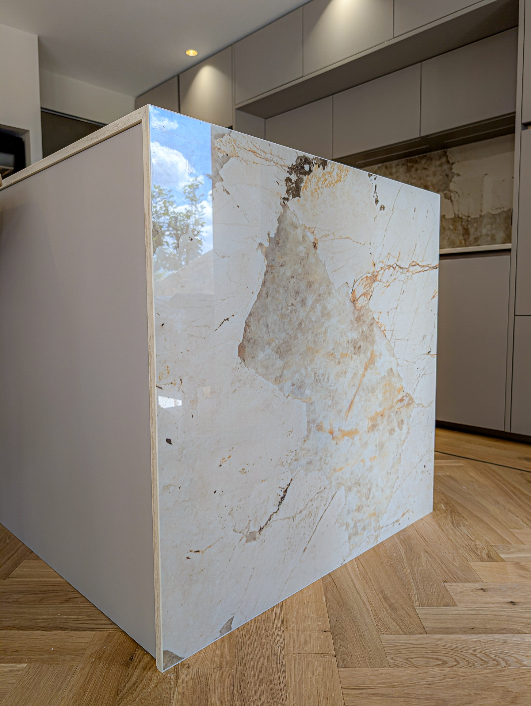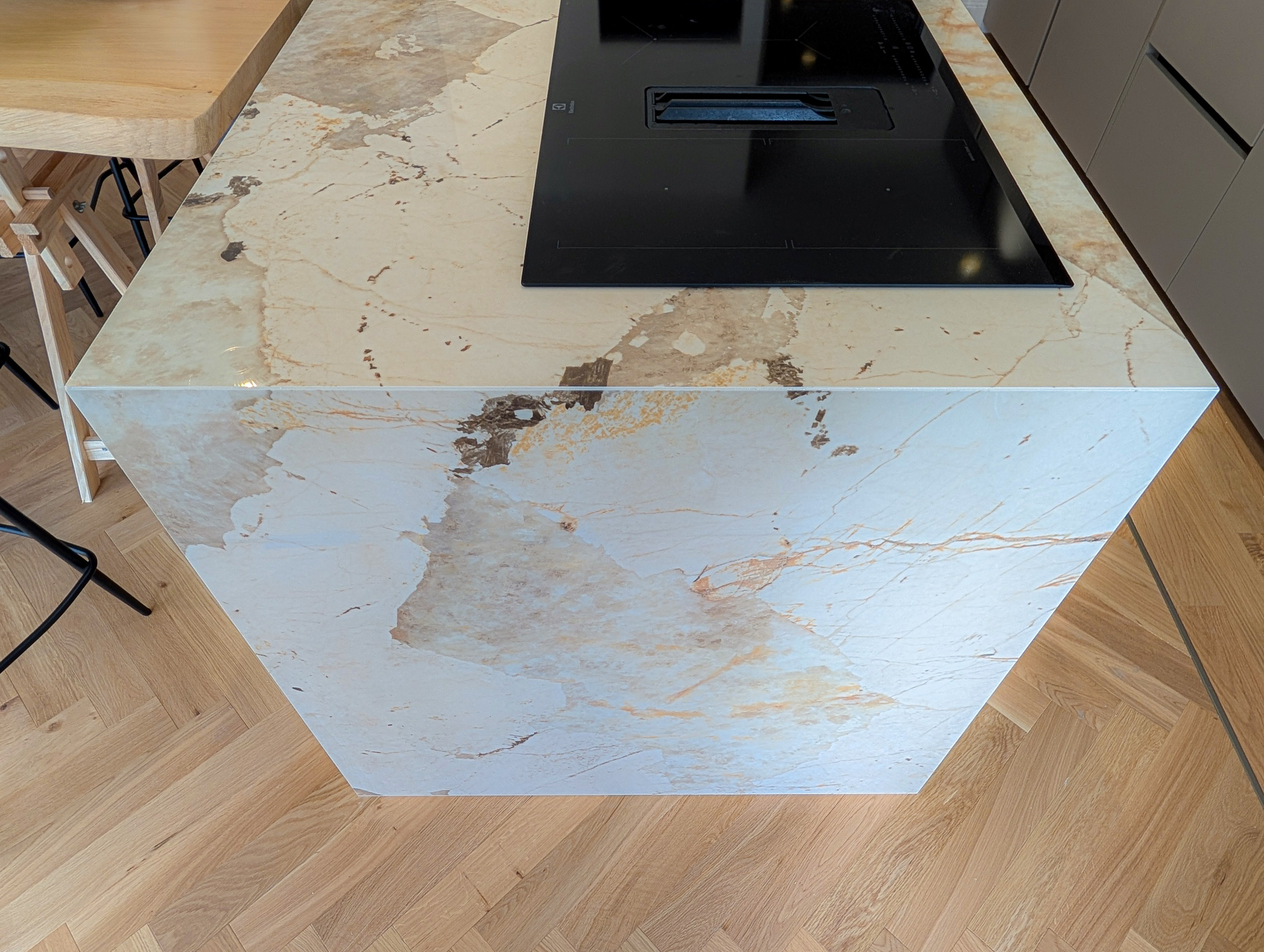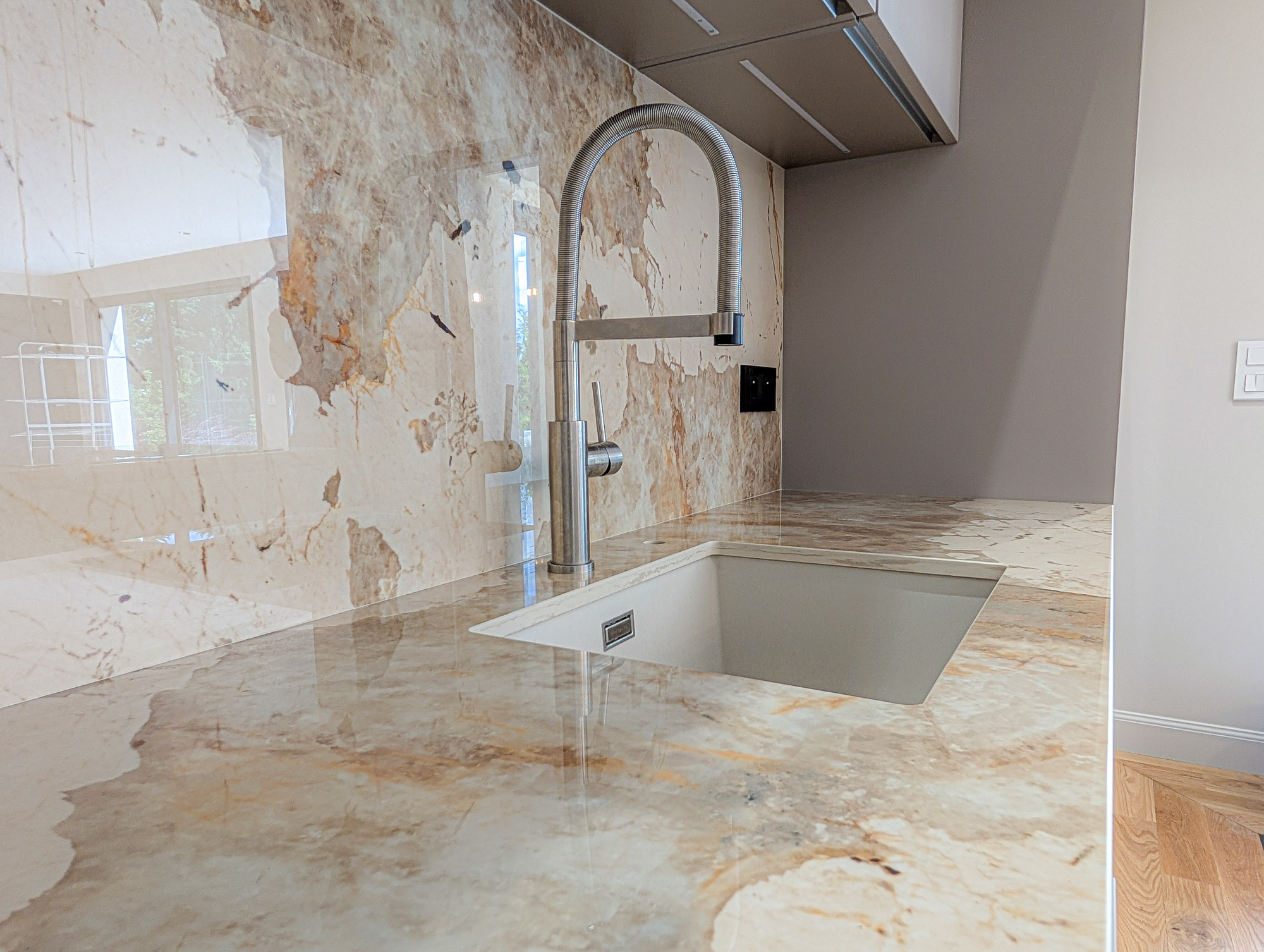 L’aménagement se compose d’un vaste îlot central aux jambages élégants, offrant une impression de monolithe sculpté dans la pierre. Un plan vasque sur mesure, accompagné d’une crédence assortie, vient compléter l’ensemble et apporter une continuité visuelle qui sublime toute la cuisine.